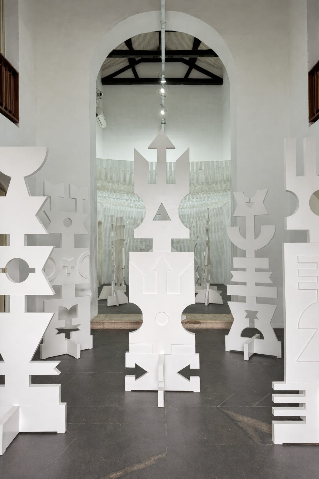 Inside a white chapel rested white-painted wooden sculptures made of geometric shapes stacked upon each other. They were larger than human size and spaced generously apart, like figures in conversation. These totem-like structures stood in careful formation, resembling a well-manicured garden that invited visitors to walk among them.